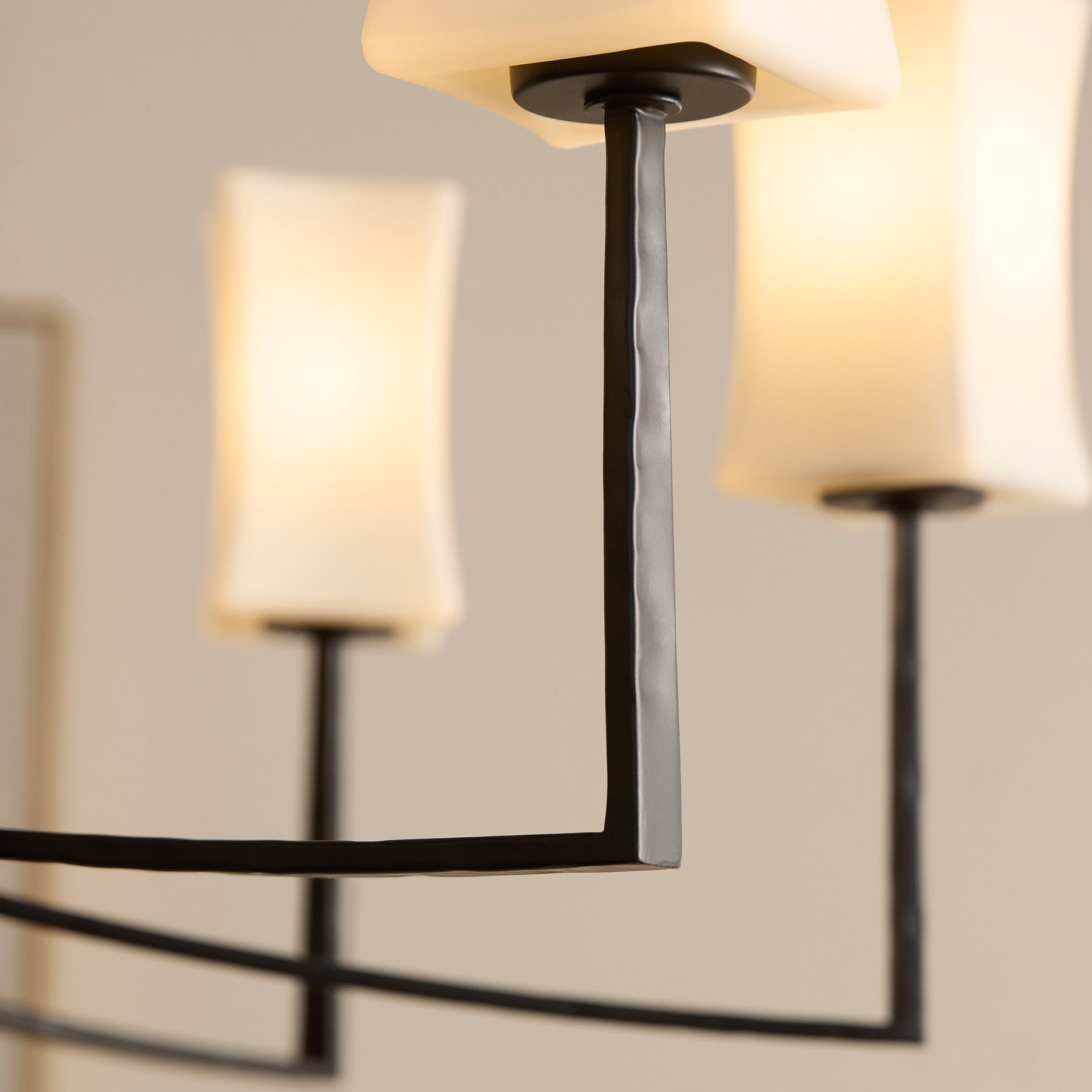 The Ayala series of chandeliers, wall mounts and sconces boasts clean lines and soft curves contrasted by right angles. The chandelier's slender stem extends down to a central cylindrical hub. From this hub, eight arms extend outwards and slightly upwards in a symmetrical arrangement. Each arm supports a rectangular satin opal glass shade with a slightly flared design at the top, housing a candelabra socket. Choose from matte black or gold leaf finishes.