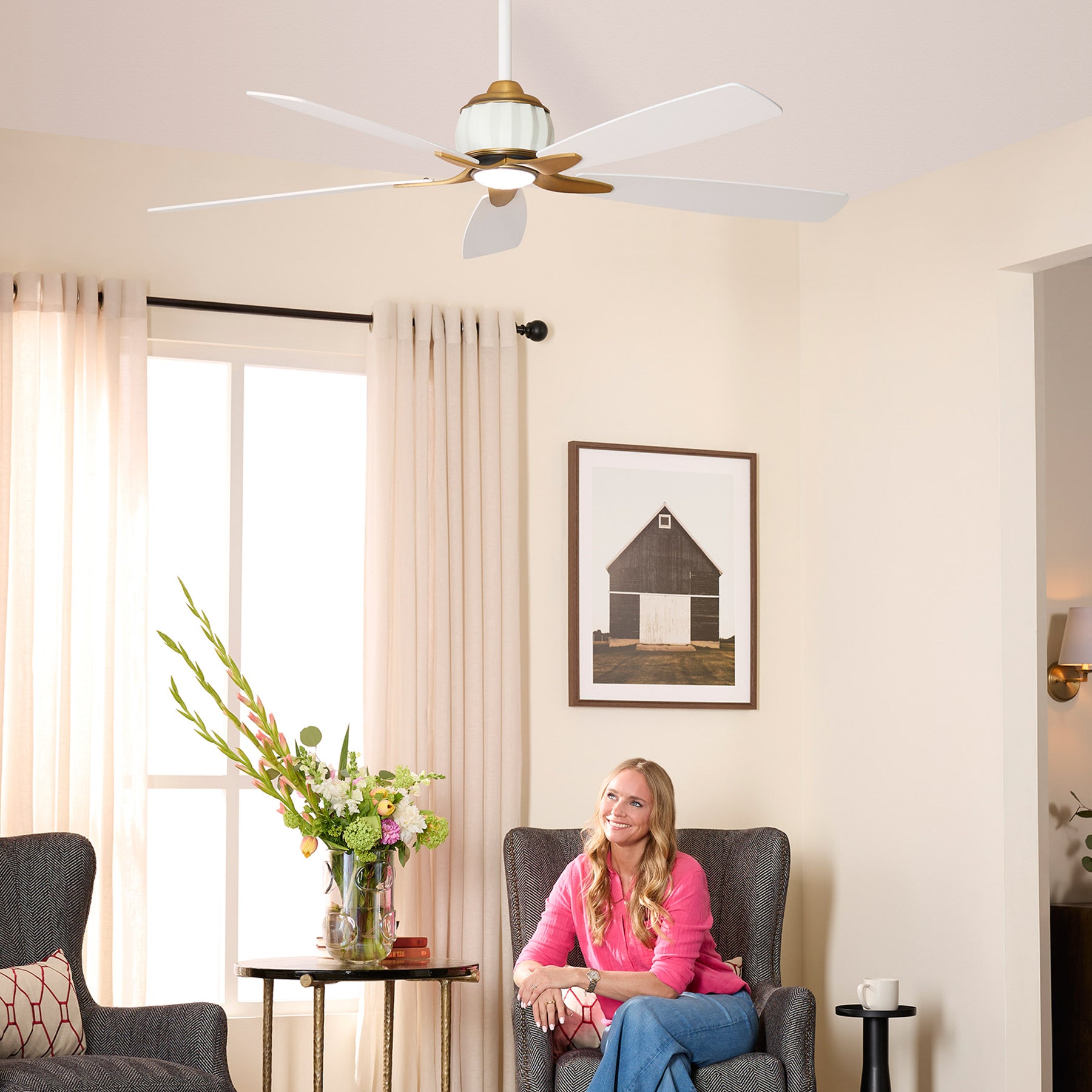 Ophelia is the perfect introduction for Tamara Day Fans, embodying her signature style with a decorative touch. Brushed brass detailing accentuates the round frame, adding warmth and sophistication. The fan's scalloped body echoes Tamara's iconic clover charm, while a case-light scalloped dome softens the glow from the integrated light. For added versatility, a brushed brass plate is included for those who prefer a sleek, non-lit option. Available in white and matte black.