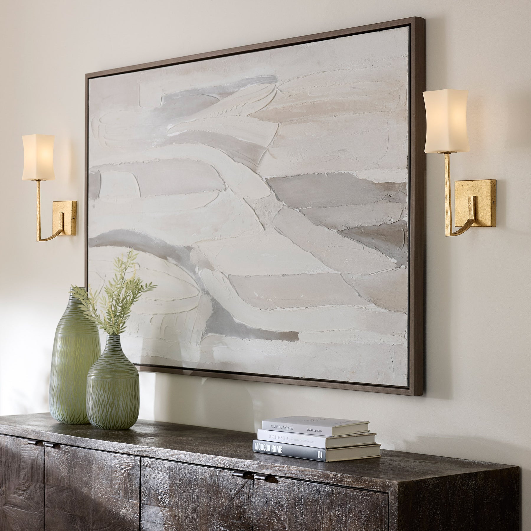 The Ayala series of chandeliers, wall mounts and sconces boasts clean lines and soft curves contrasted by right angles. From the wall mount's slim backplate, an arm extends outward and slightly upwards. A rectangular, satin opal glass shade with a slightly flared design at the top houses a candelabra socket. Choose from matte black or gold leaf finishes.
