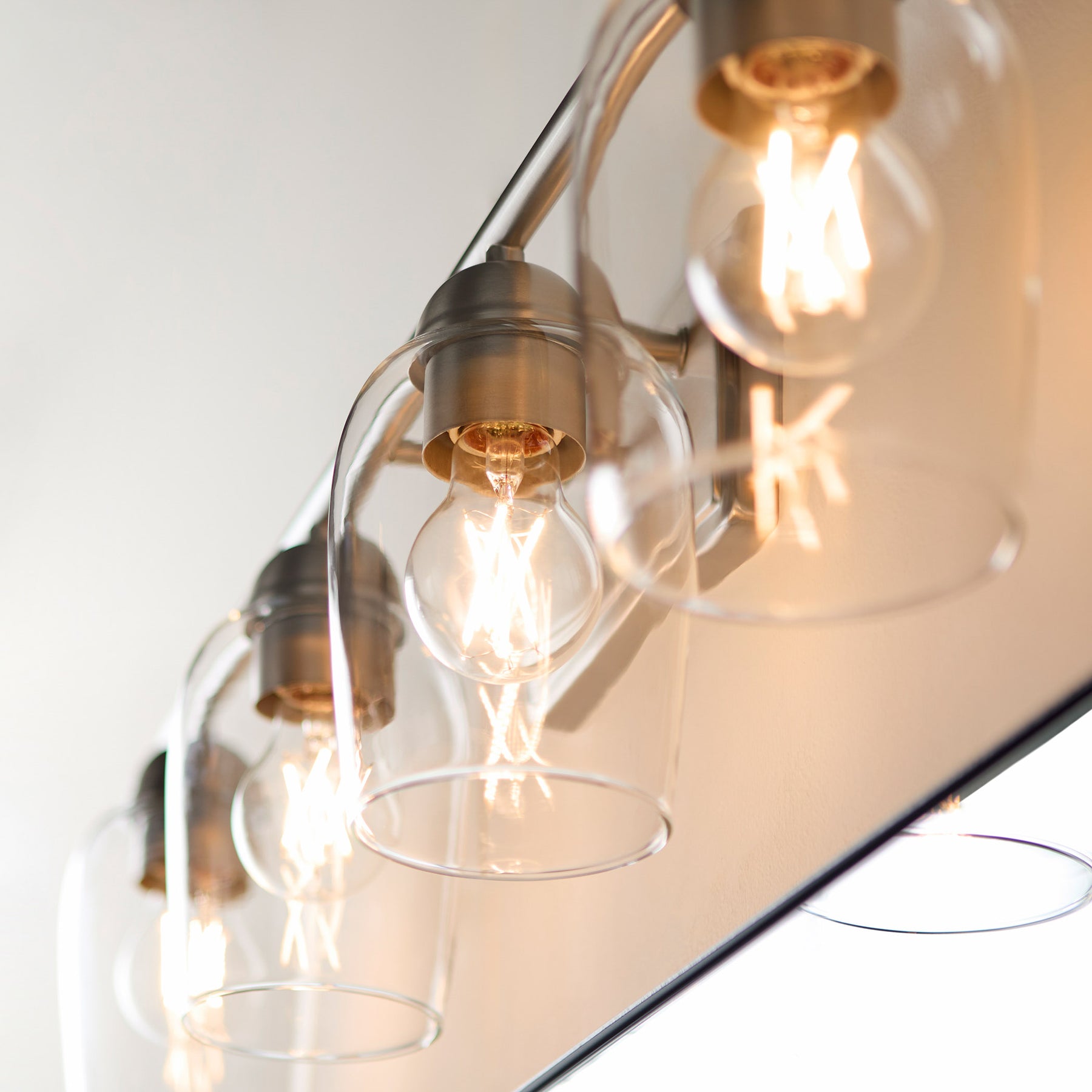 Dive into balanced design with the Wallinger family of our Main Street collection of lighting solutions. Classic lines and industrial design make this series a versatile piece that complements various interior styles, from modern to rustic. A vast selection of wall mounts, vanities, and chandeliers are available in aged brass, matte black, or satin nickel. Medium base lamps and clear glass shades make these fixtures a home design staple.