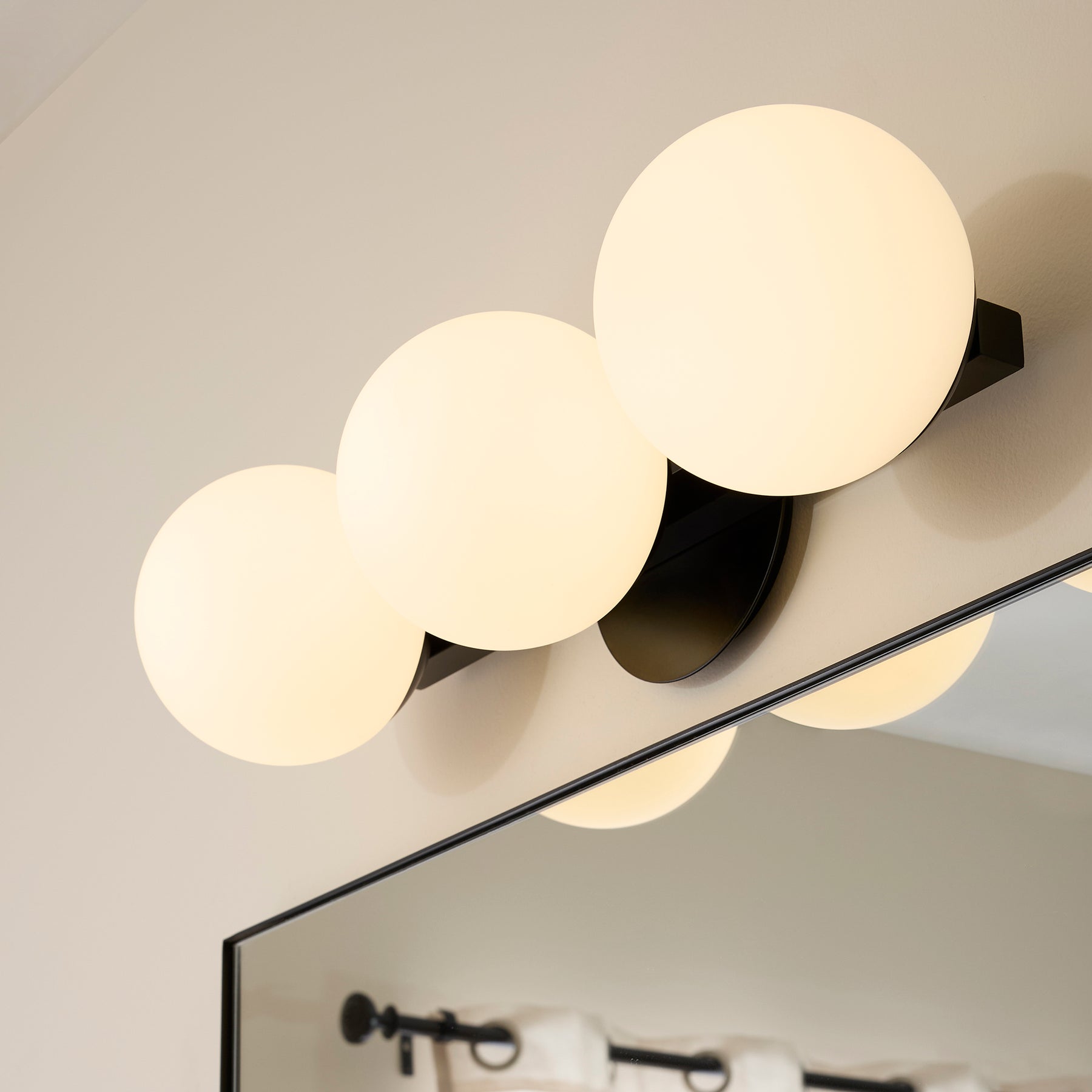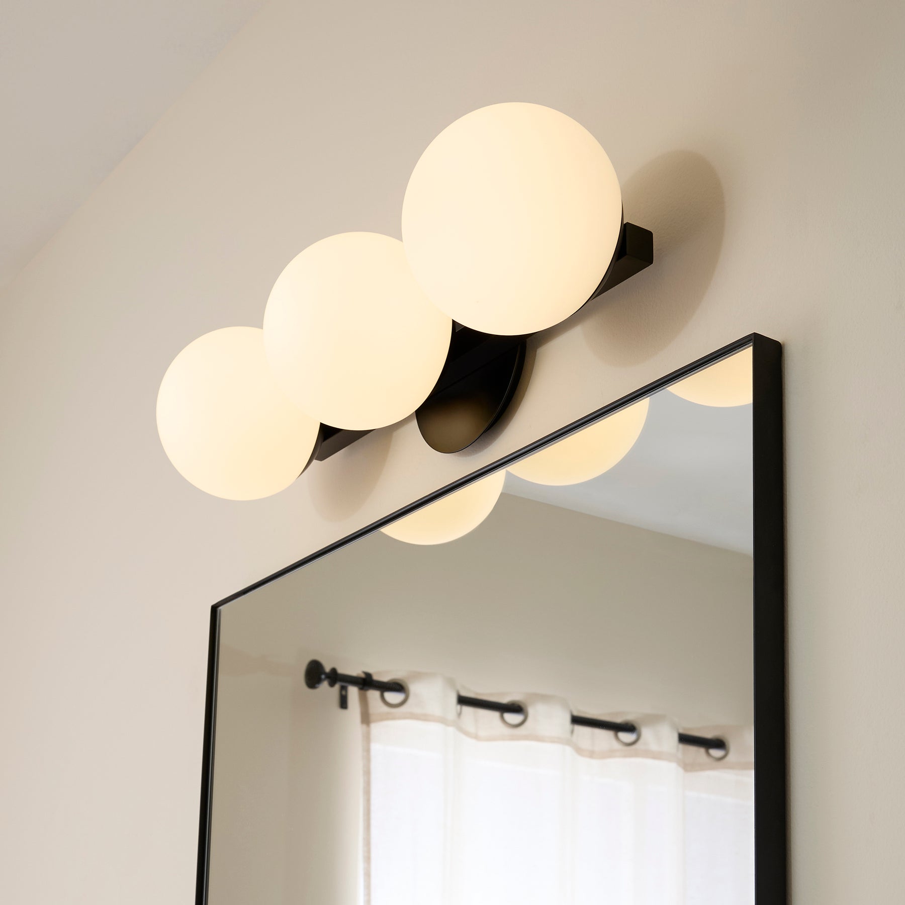 Supremely minimal and expertly crafted, the Globe series of contemporary lighting adds modern industrial energy to any space. Satin opal globes rest on slender frames, allowing the glass spheres to be the focal point of the design. Choose from a single light wall mount or select a two, three, or four light vanity and illuminate your space with style and ease.