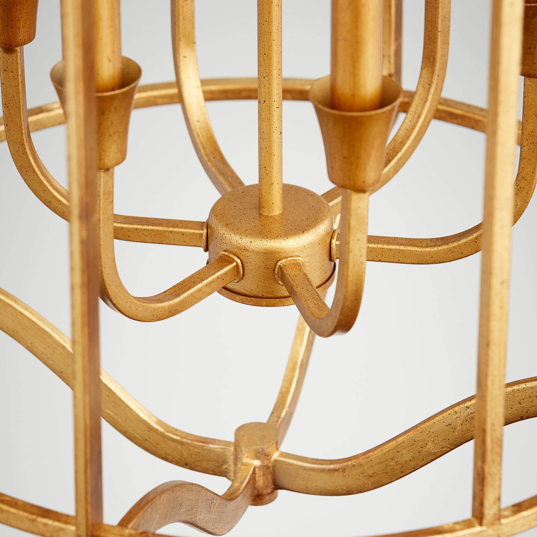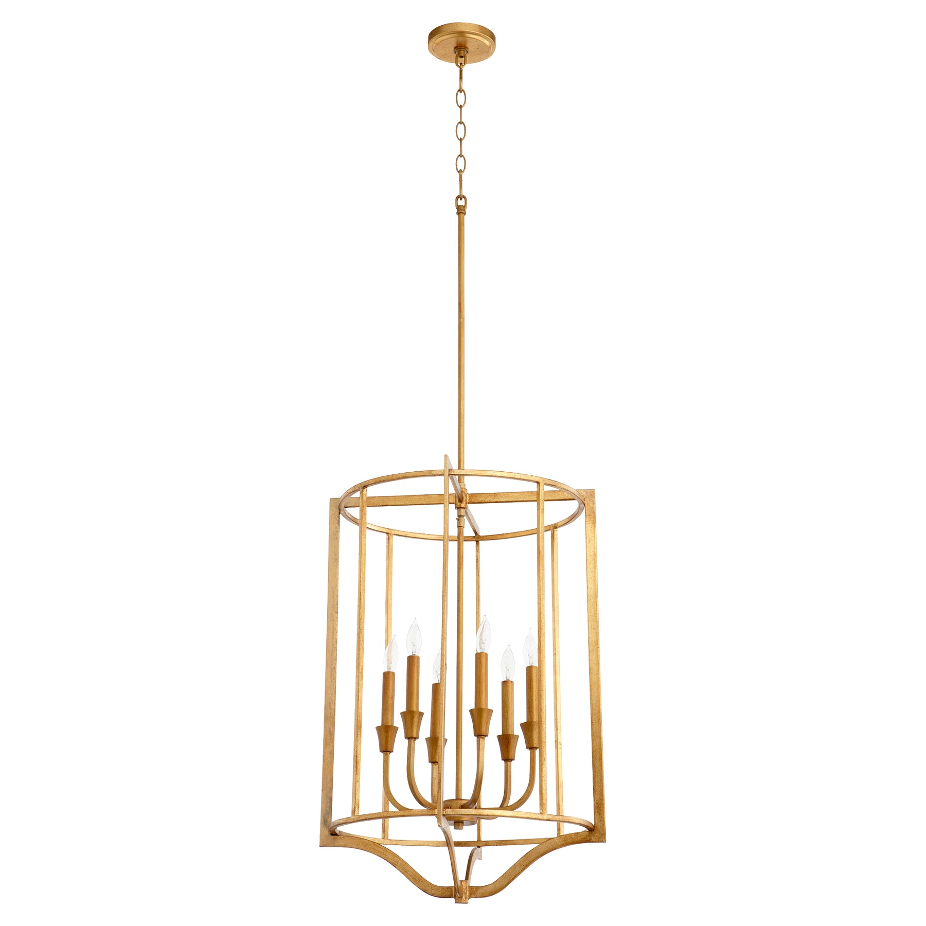 Classic form, minimal elements, and a striking Gold Leaf finish make for a standout design in the Marquee pendant. The striking finish embellishes the metalwork, delivering subtle sophistication. An updated classic, this chandelier showcases a drum silhouette with 6 candelabra bulbs perched atop to offer a boost of brightness in any room. Its generous size helps it grab glances from guests, while its open design and solid finish ensure it won’t overwhelm your space. For a more restoration style, pair with filament bulbs (not included) for a warm ambiance.