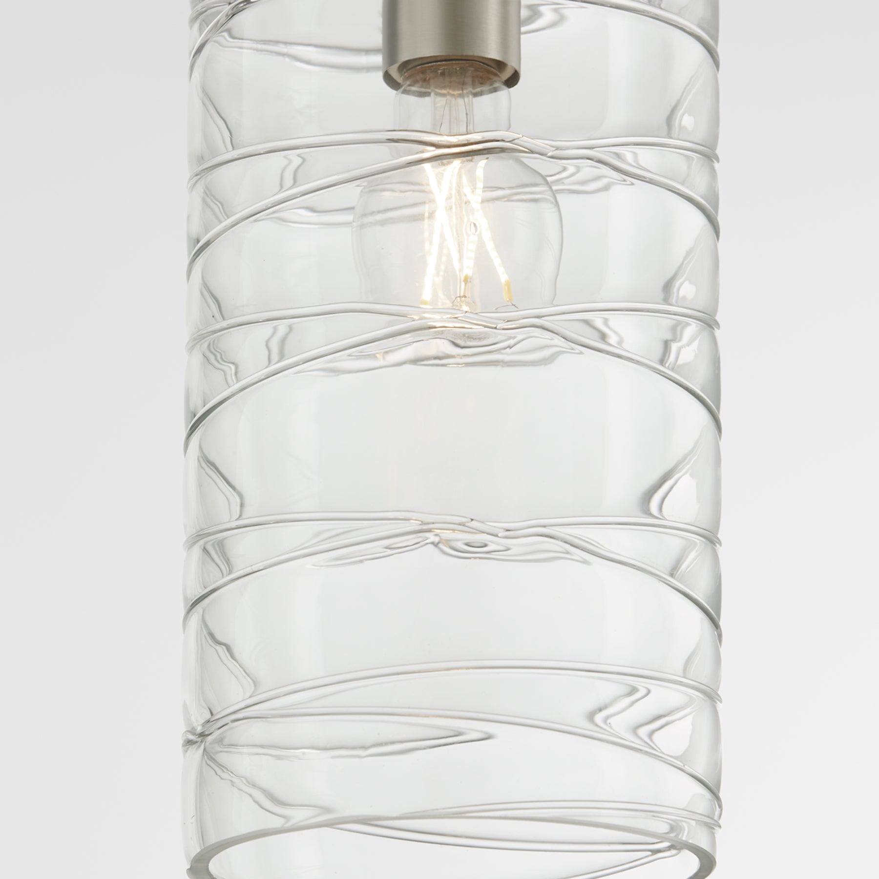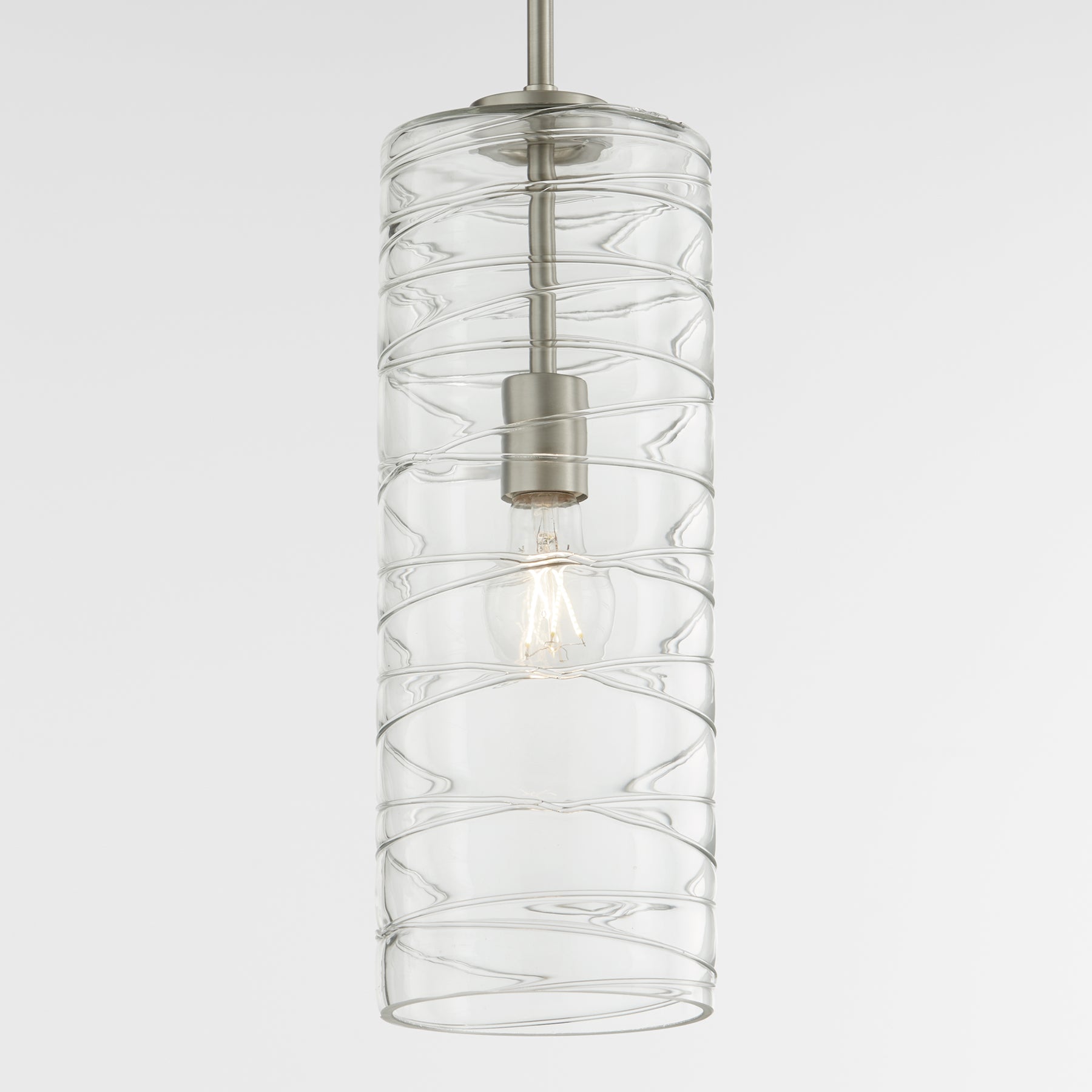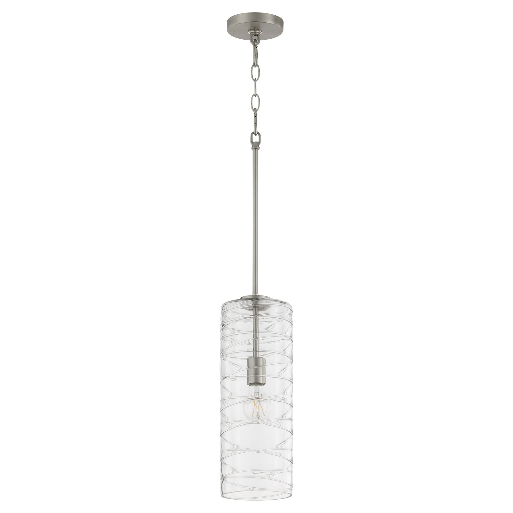 This cylinder pendant adds a contemporary-chic styling to any setting. The blown clear textured glass shade and Satin Nickel finish combine to elevate this fixture’s modern appeal. A dual chain and stem hanging system allow for granular variability in height. Add a warm glow to your kitchen, bedroom, or bathroom with this lovely luminary.