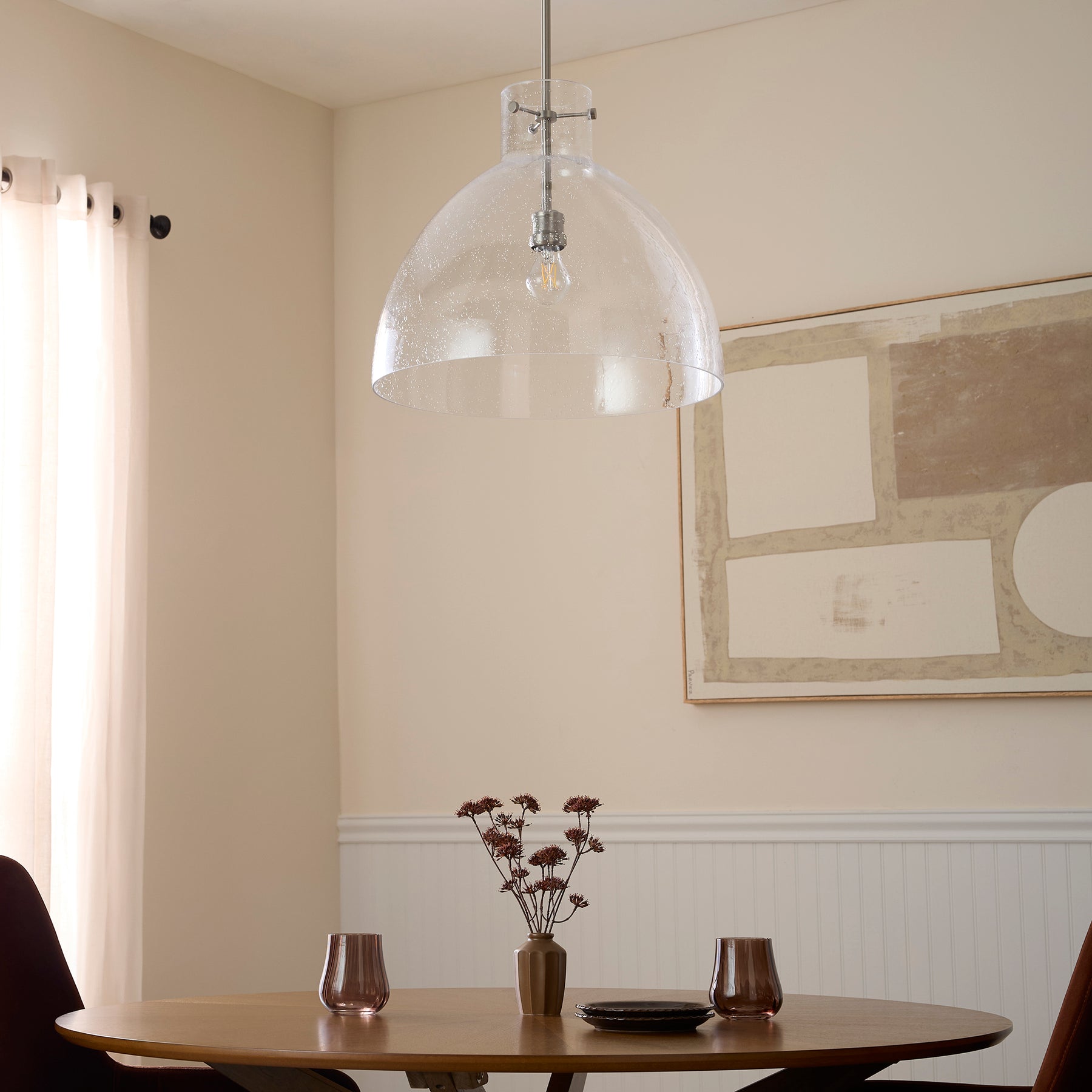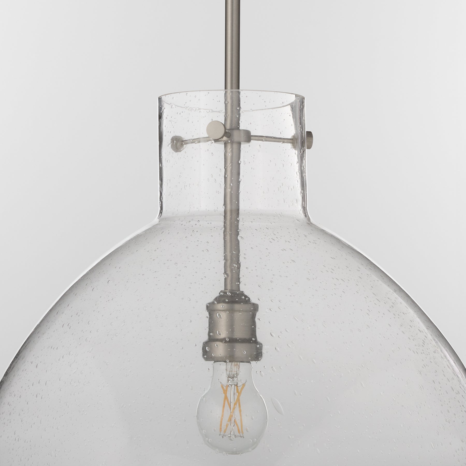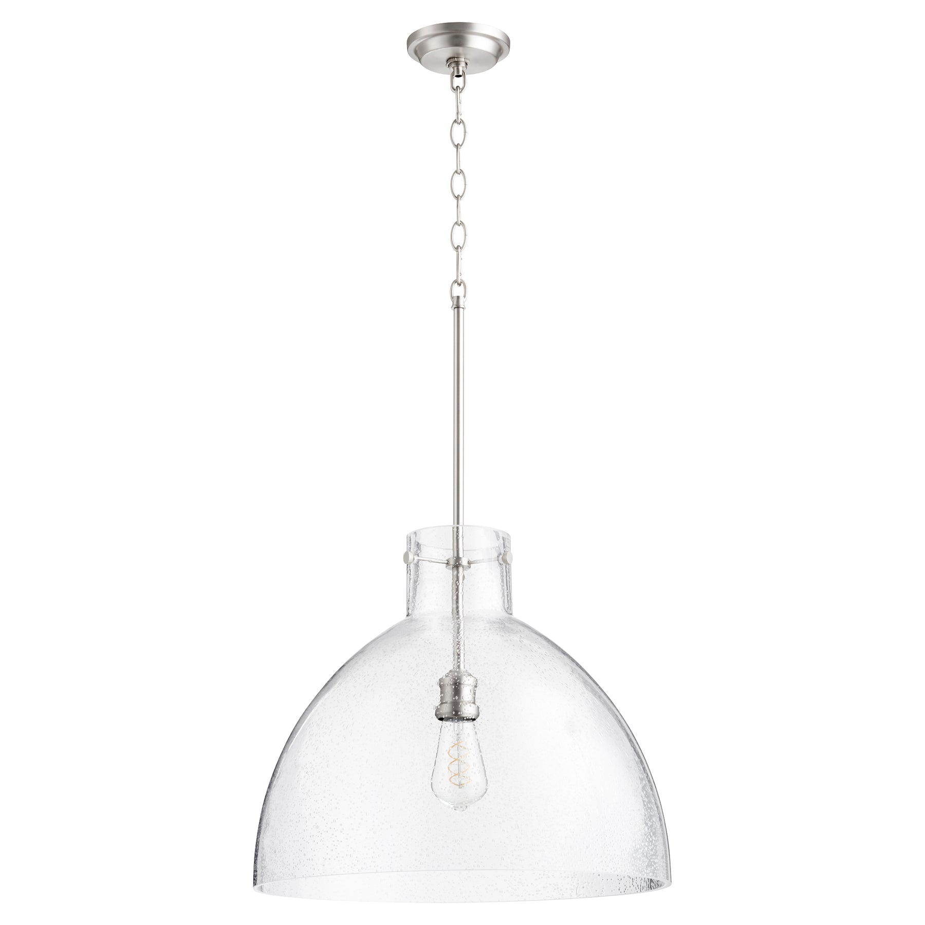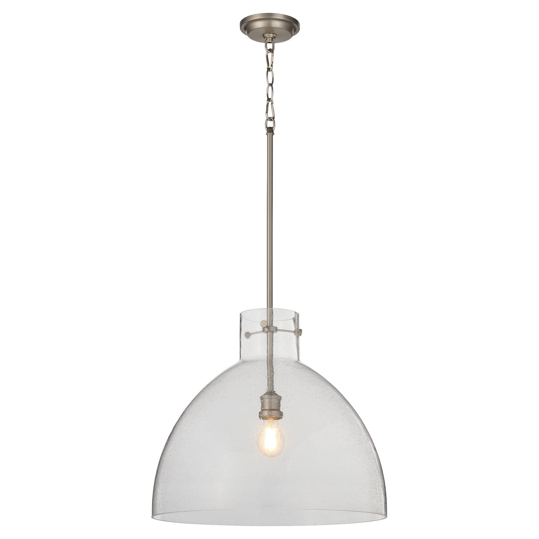 A great complement to any style, this clear seeded glass pendant will cast a luminous glow on your space. This hybrid chain-rod hung fixture is supplied with one foot of chain and varying sizes of stem, for adjustability to varying ceiling heights. The Satin Nickel finish is a great pairing to the artistic look. A medium base, 60W bulb is all you need to complete the look.